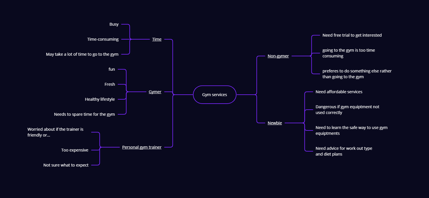 Completing a mindmap allowed me to define "how might we provide a website that helps to calculate; recommended workout and diet plans for tertiary students?" It allowed me to explore this statement in better depth. I started the process by creating five categories: time, gymer, non-gymer, personal gym trainer, and gym newbie. Then I explored more profound into the primary connections; the problems differed from person to person depending on what category they are in. I realised that mindmaps visually organised issues, actors, and their relationships, making it much easier to identify the problems.