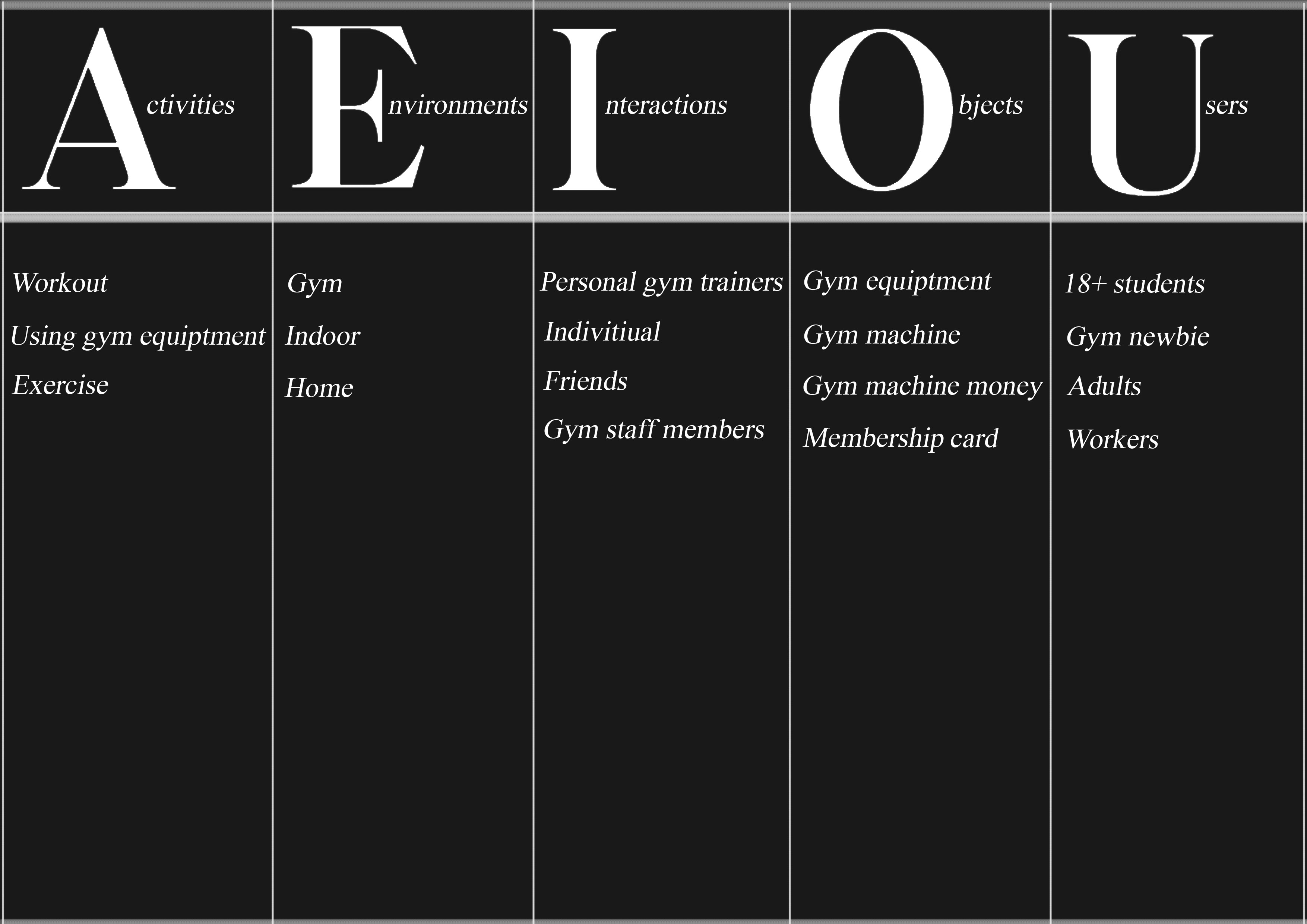 To create the AEIOU framework, I first went to the gym and then categorised the information into the following order: activities, environment, interaction, object and users. Doing this allowed me to interpret observations gathered; helps address the client's issues.