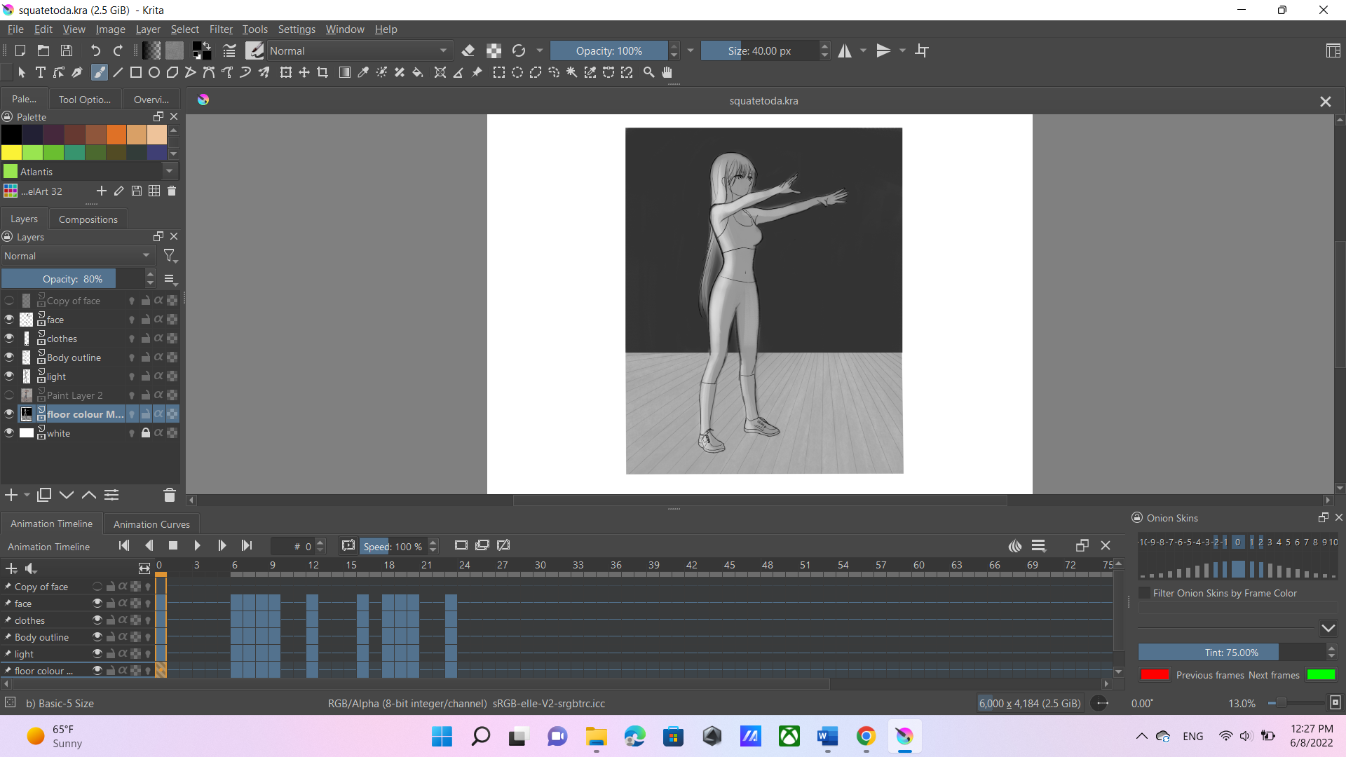To make the tutorial, I searched youtube for videos on how real people do squats properly. As I watched the video I took 98 pictures of the person doing the squat (to capture and study how muscles move to make a more natural animation) and narrowed it down to 10 photos that were best. This was my first time using Krita, so before animating searched youtube for tutorials to get me started. In the process of using Krita I realised how time-consuming 2D animating was; I had to draw out the outline of every frame with very thin brushes; I was going to colour every frame, but I didn't have enough time, so I at least tried to shade every frame to make it look a little more appealing.