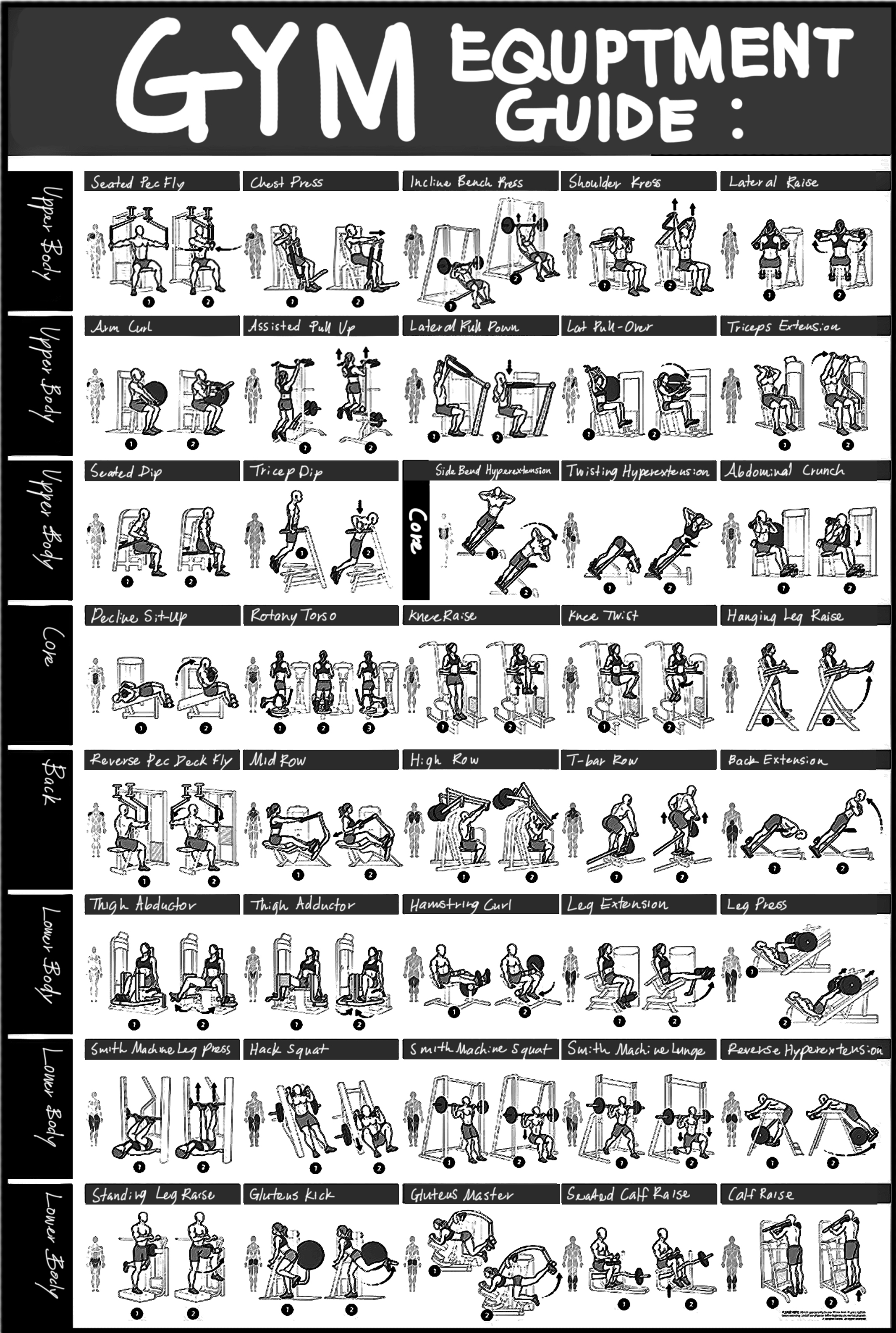 Considering that many people may not know how to use the gym equipment so I realized that a tutorial poster with all the instructions as a picture would help those people who prefer not to hire a personal trainer. This poster includes instructions for the upper body, core, and back to lower body.